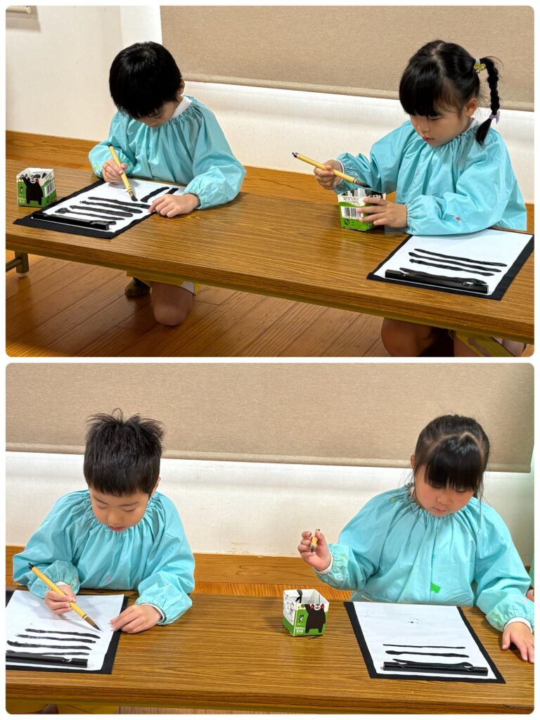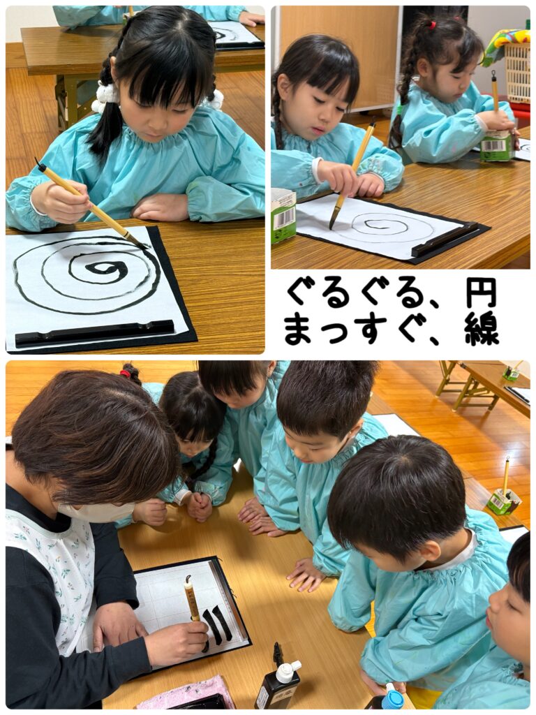 習字道具「墨汁」「文鎮」「半紙」「筆」など道具の名前を教えてもらい、始まりました。先生(指導免許がある保育士)のお手本を見てぐるぐる円や、まっすぐ線を慎重に書きました。自分の名前の一文字を選んで書いたりもしました。鉛筆で書くときより、緊張していた様子でした。